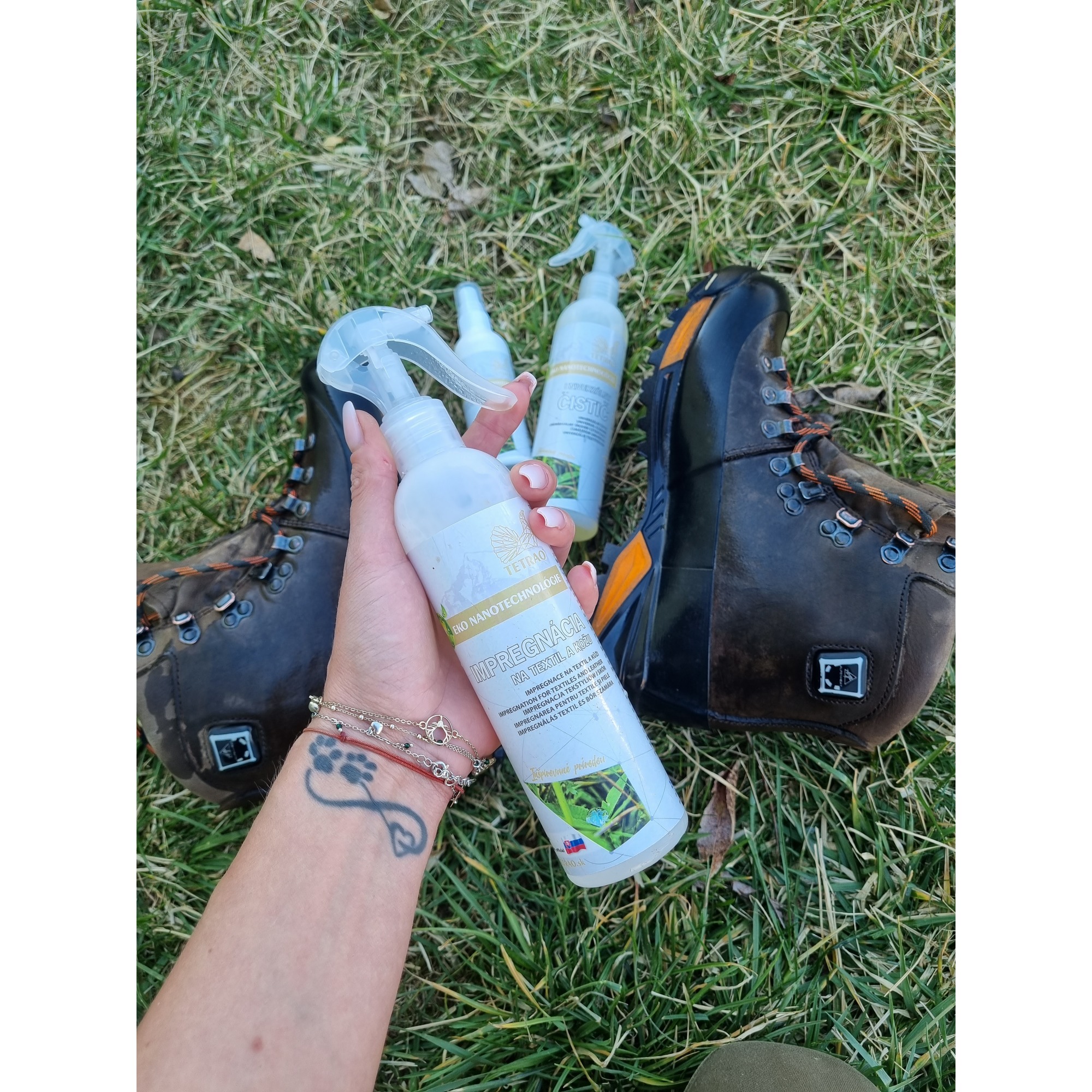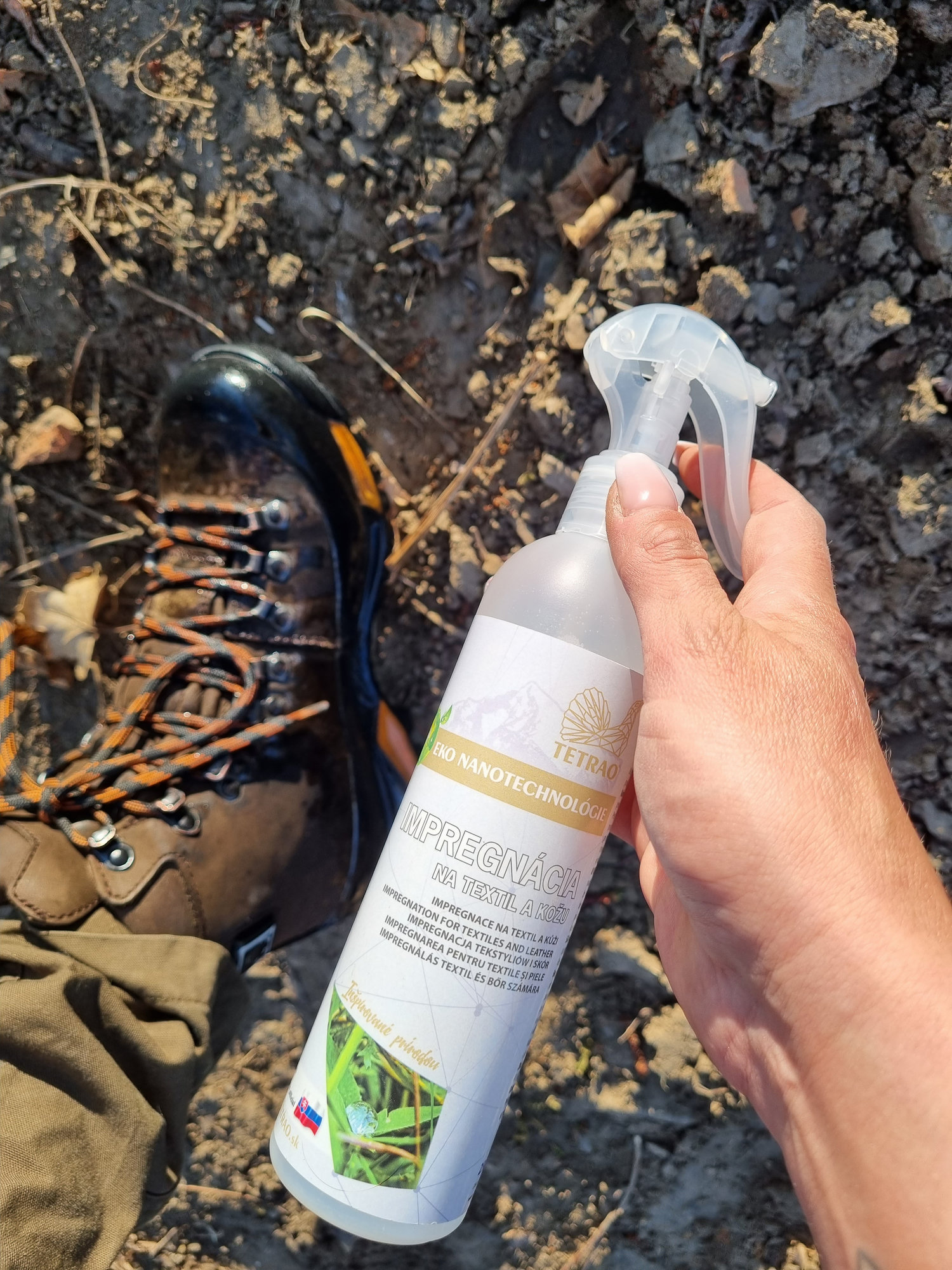 TETRAO Nanometryczna impregnacja obuwia, tekstyliów, odzieży i skóry. Ten wysokiej jakości ekologiczny impregnat nadaje się do impregnacji prawie wszystkich rodzajów tekstyliów nieimpregnowanych, skóry naturalnej i sztucznej nielakierowanej i polerowanej. Skuteczna impregnacja odpycha wodę z butów, ubrań i wszelkiego rodzaju tekstyliów, w tym namiotów, chroniąc w ten sposób ich strukturę. Produkt składa się z niewidocznej ekologicznej nanopowłoki pokrywającej powierzchnię, która chroni Twoje buty lub tekstylia przed brudem i wodą. Powierzchnia jest odporna na wodę, błoto, śnieg, sól drogową i inne zanieczyszczenia. Preparat odpycha cząsteczki wody, dzięki czemu znacznie wydłuża żywotność materiału i czas pomiędzy procesami czyszczenia.